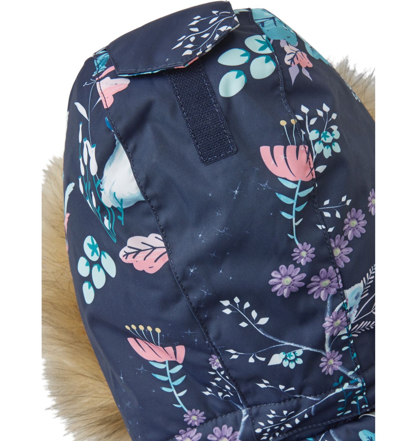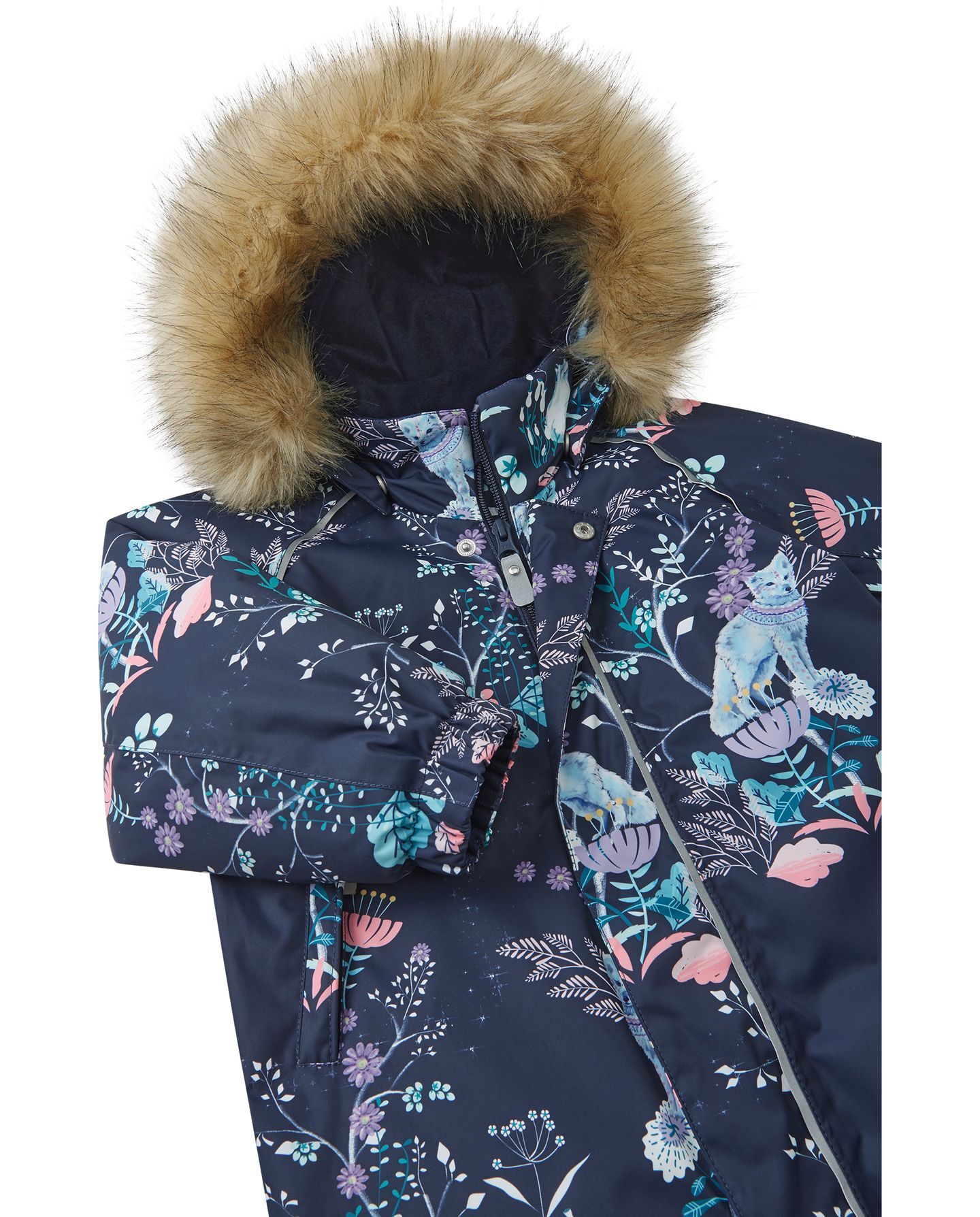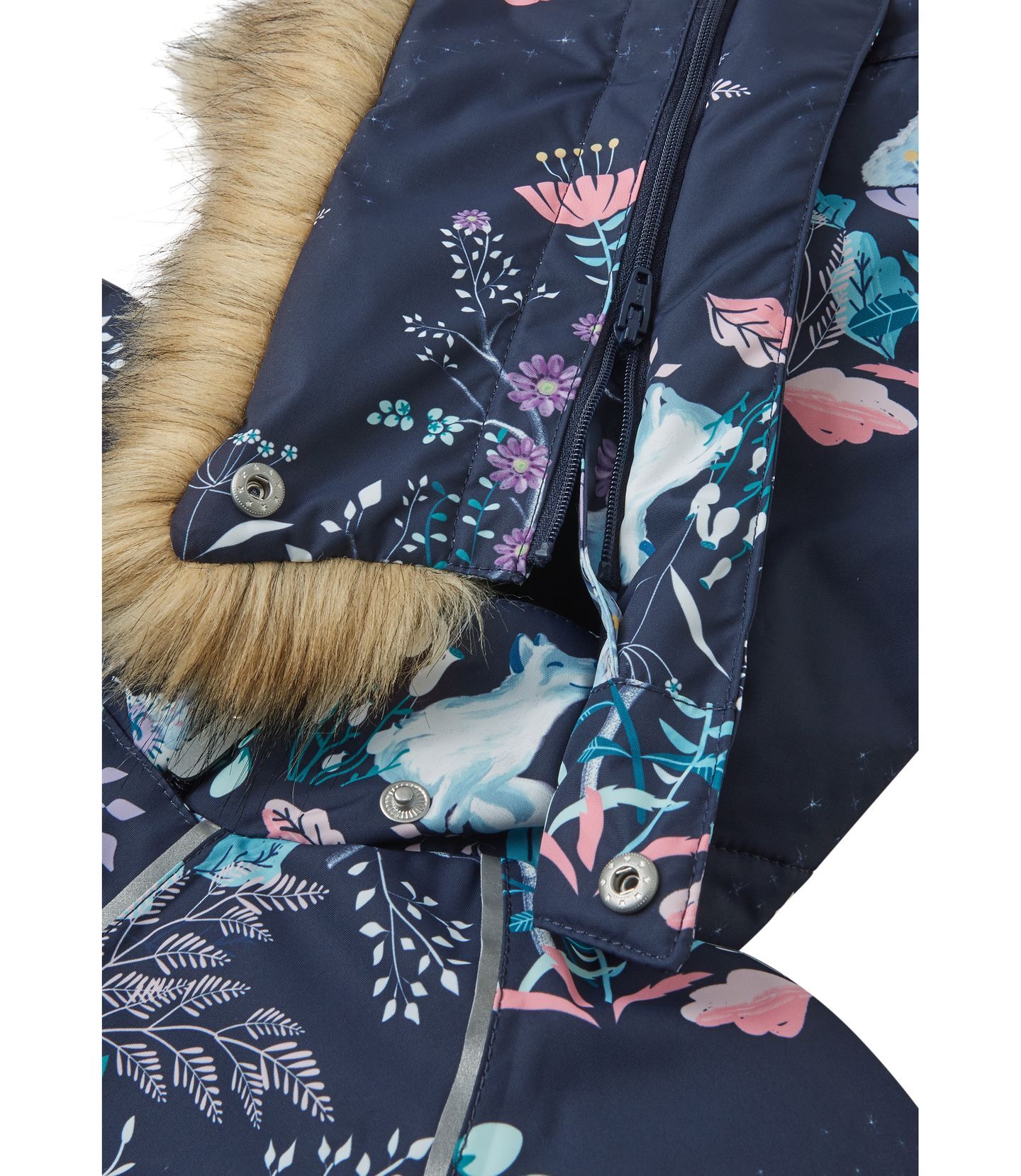 - Nuimamas dirbtinio kailiukas – ne tik stilingas, bet ir saugus: jei kliūna už šakos, gobtuvas atsisega.