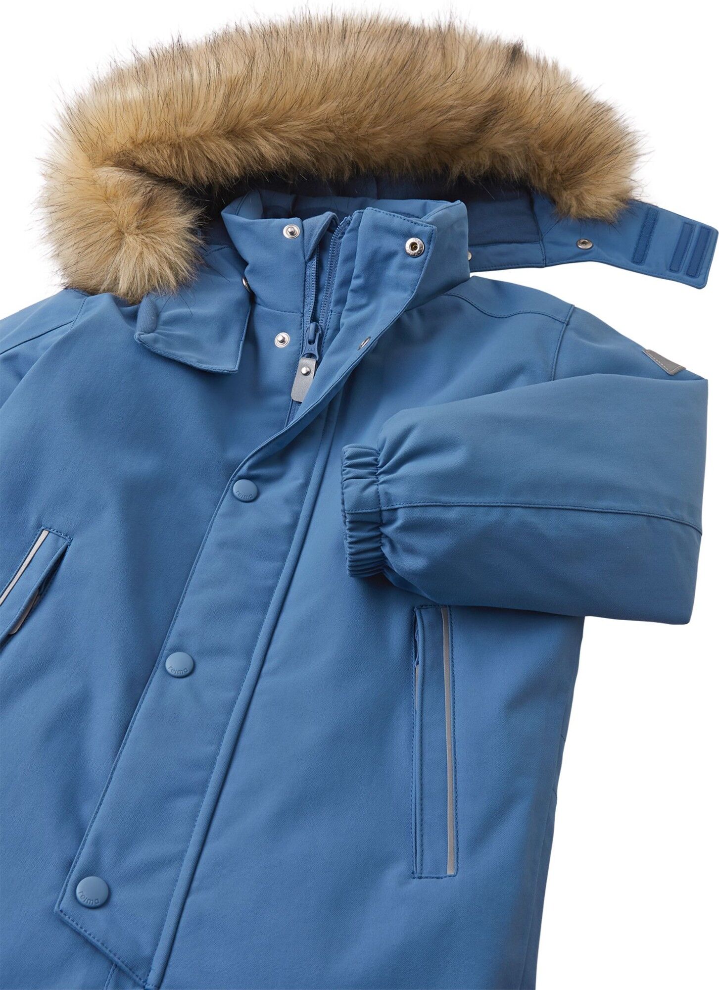 - Nusegamas dirbtinio kailio gaubtas – nuėmus nebelieka pavojingų sagų, o užsegus – šilta net per didžiausią pūgą