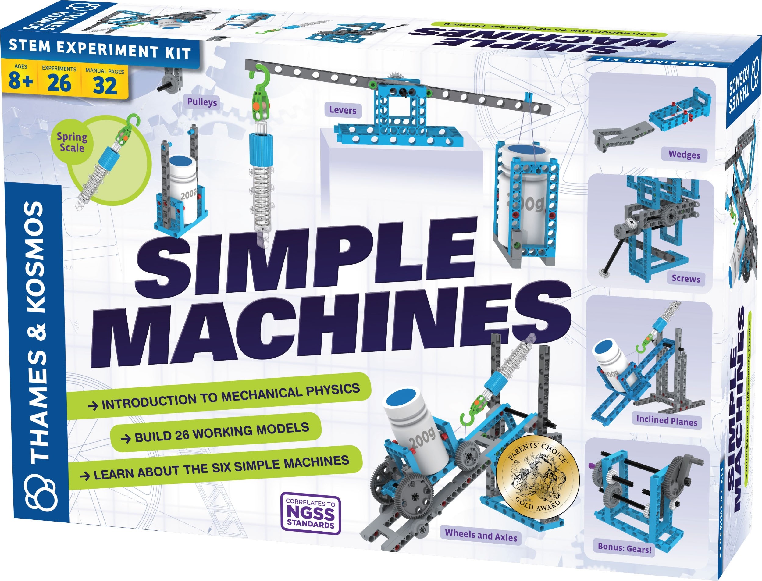. Pasinaudokite šiuo rinkinius ir pagilinkite savo mechaninės fizikos žinias. Išmokite viską apie paprastus mechanizmus ir tai, kaip juos naudojant supaprastinti sudėtingas užduotis. Atlikdami 26 modelių konstravimo pratimus ištirsite visus šešis klasikinius paprastuosius mechanizmus – ratus ir ašis, svirtis, skriemulius, pasvirusias plokštumas, varžtus ir pleištus bei pavaras. Pradėkite nuo paprastų modelių, kurie suteiks tvirtą supratimą apie pagrindinius veikiančius principus, o tuomet pereikite prie didesnių, sudėtingesnių modelių, leisiančių ištirti sudėtingesnes mašinų galimybes ir pamatyti, kaip jos gali veikti kartu. Taip pat rinkinyje yra specialiai suprojektuota spyruoklinė skalė, su kuria galėsite pamatuoti, kaip mechanizmai keičia kryptį ir nustatyti jėgų, padedančių lengviau atlikti darbą, dydžius.