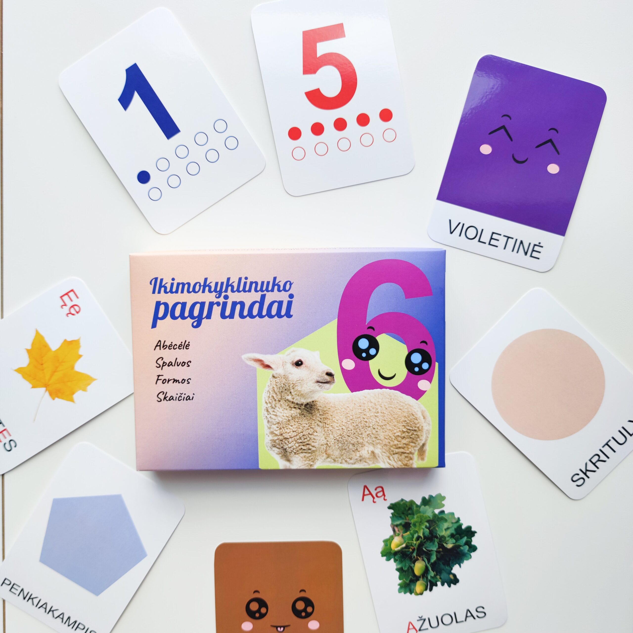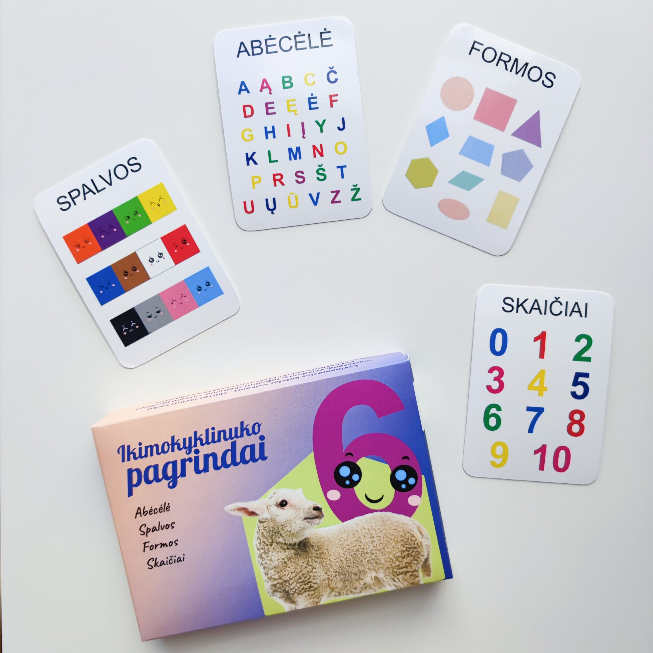 Kortelių rinkinyje rasite 68 korteles. Rinkinį ikimokyklinuko pagrindai sudaro tokios temos kaip: abėcėlė, spalvos, formos, skaičiai.