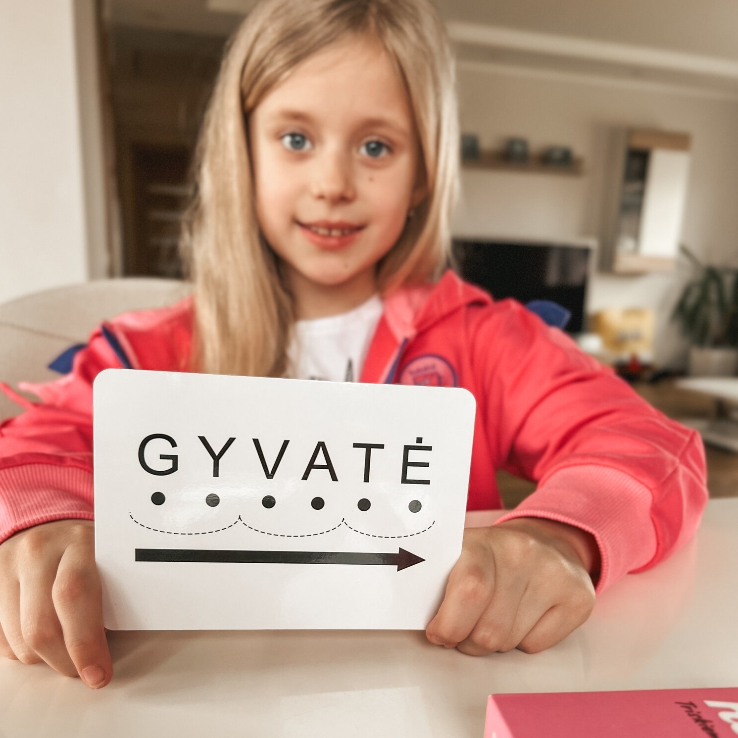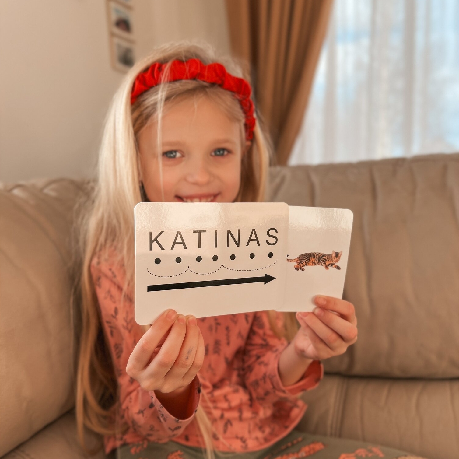 Rinkinyje rasite žodžio ir atitinkamo paveikslėlio kortelę. Pavyzdžiui žodis “PIPIRAS”. Paprašykite vaiko išvardinti visas raides: „pė“, „i“, „pė“, „i“, „er“, „a“, „es“.