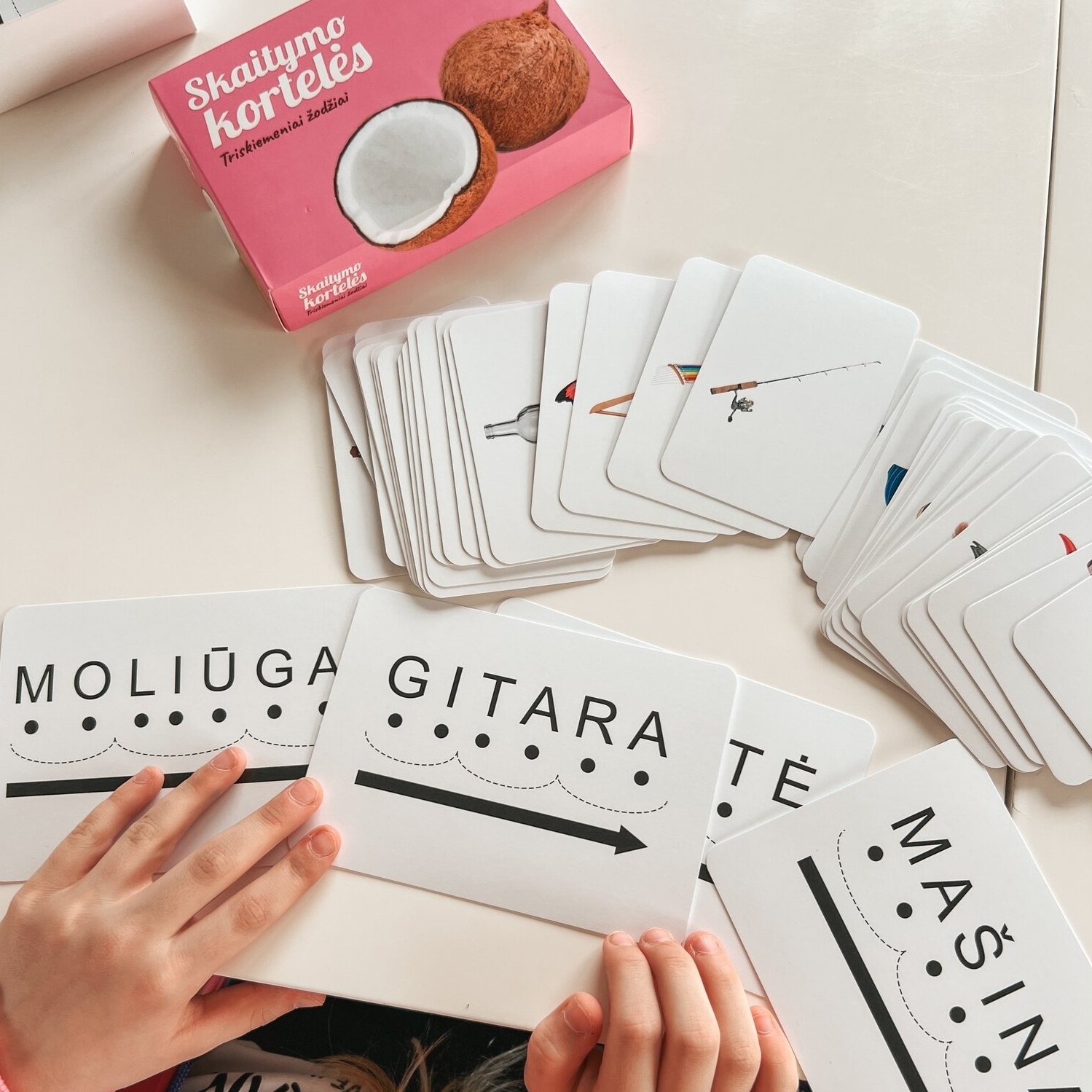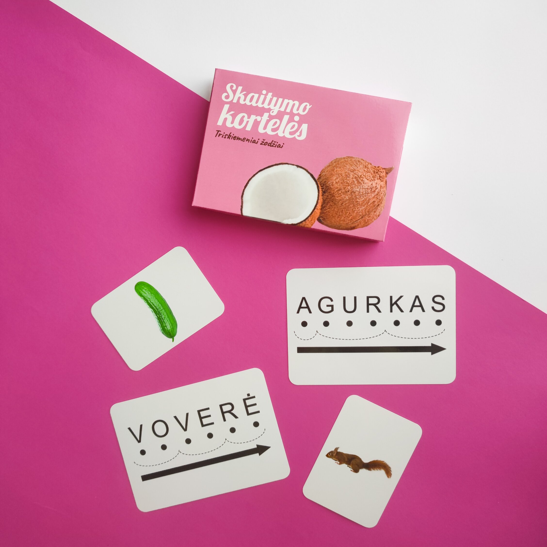 Rekomenduojama triskiemenių žodžių korteles rinktis kai vaikas jau atpažįsta ir geba sujungti dviskiemenius žodžius. Dviskiemeniams žodžiams rekomenduojame rinktis populiariausias Yesforskills skaitymo korteles.