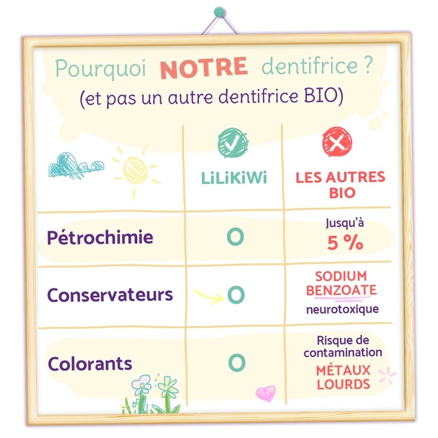 Pasta pagaminta iš 100 % natūralios kilmės ingredientų, be petrocheminių medžiagų. Sudėtyje nėra konservantų ir dažiklių, todėl vaikai nepatiria rizikos netyčia nuryti nereikalingų ar kenksmingų ingredientų. Fluoras (1000 ppm) padeda stiprinti dantų emalį ir veiksmingai saugo nuo ėduonies.