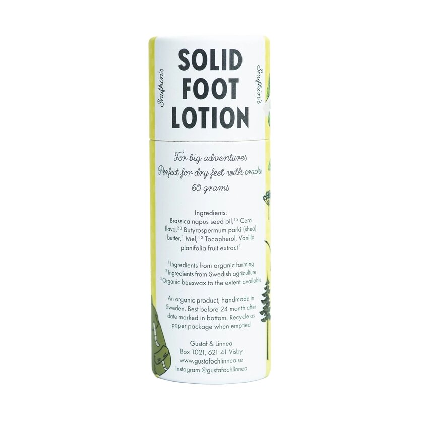 Produktas supakuotas į aplinkai draugišką popierinę pakuotę, papuoštą „Muminų“ pasaulio motyvais su Snufkin personažu. Kiekvienas pėdų balzamas gaminamas rankomis Gotlande, nedideliame šeimos versle, kuriam svarbus tvarumas, pagarba gamtai ir atsakinga gamyba.