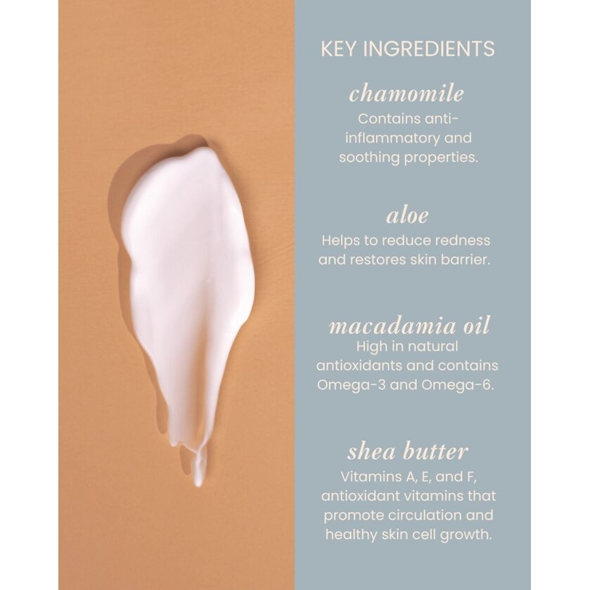 Formulė praturtinta makadamijų aliejumi ir taukmedžio sviestu, kurie maitina ir minkština odą, alavijo lapų sultimis ir ramunėlių žiedų ekstraktu, padedančiais palaikyti odos komfortą ir ramybės pojūtį, bei glicerinu, kuris padeda išlaikyti odos drėgmę. Kruopščiai atrinkti ingredientai užtikrina švelnią, bet veiksmingą kasdienę priežiūrą jautriai odai.