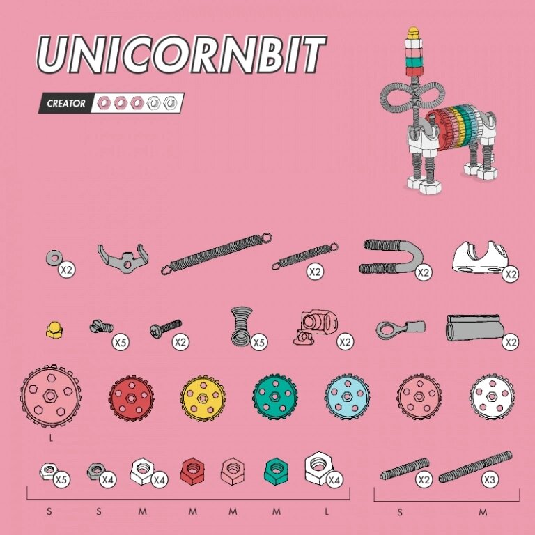 UnicornBit – reta ir magiška būtybė, sudaryta iš spalvingų veržlių, varžtų ir unikalių detalių. Šis „supergalių“ turintis vienaragis skatina vaikų vaizduotę ir kūrybišką žaidimą, leidžiant kurti ir atrasti naujas formas per konstravimą.