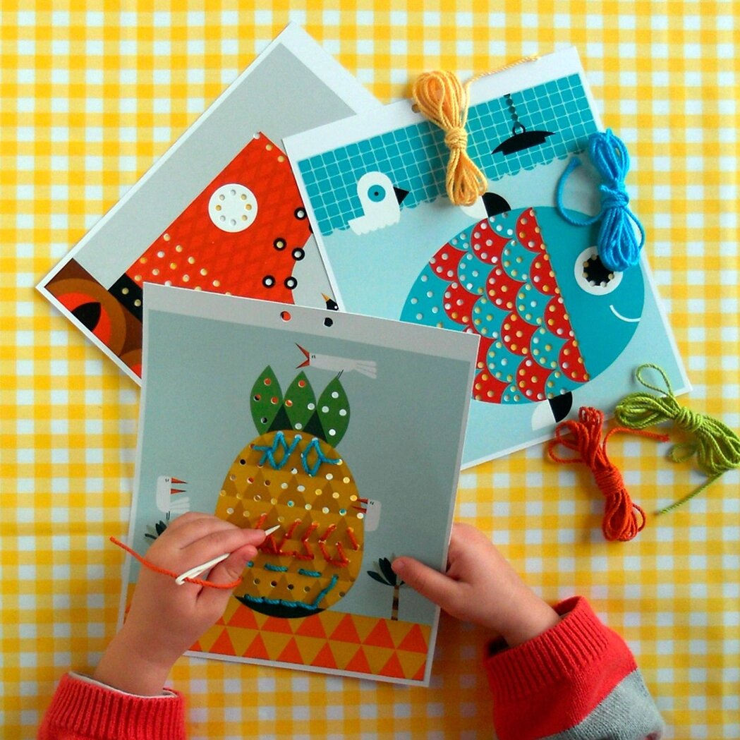 Rinkinyje esantys trys kartoniniai šablonai su iliustracijomis – ananasu, žuvimi ir batu – kviečia vaikus lavinti vaizduotę, smulkiąją motoriką bei rankų ir akių koordinaciją. Baigus siuvinėti, kiekvieną darbelį galima pakabinti, nes viršuje yra specialios skylutės.