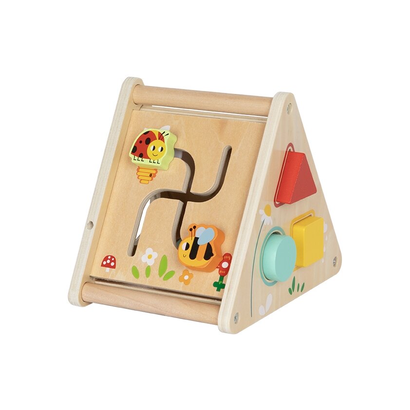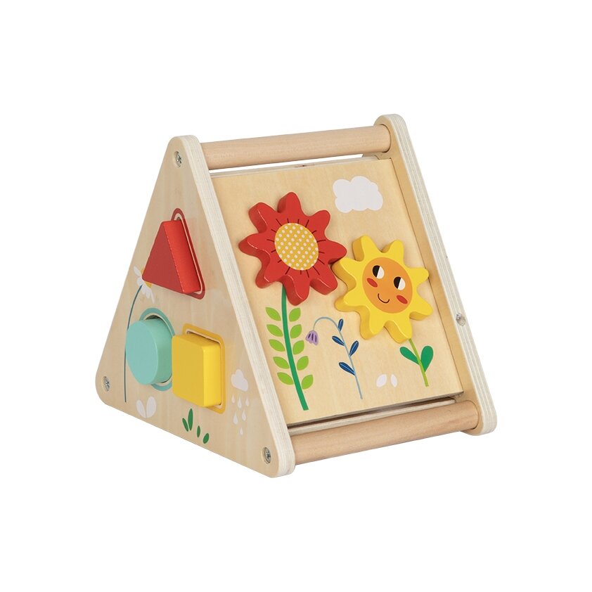 - Medinė veiklų lenta su formų rūšiavimu ir besisukančiais krumpliaračiais