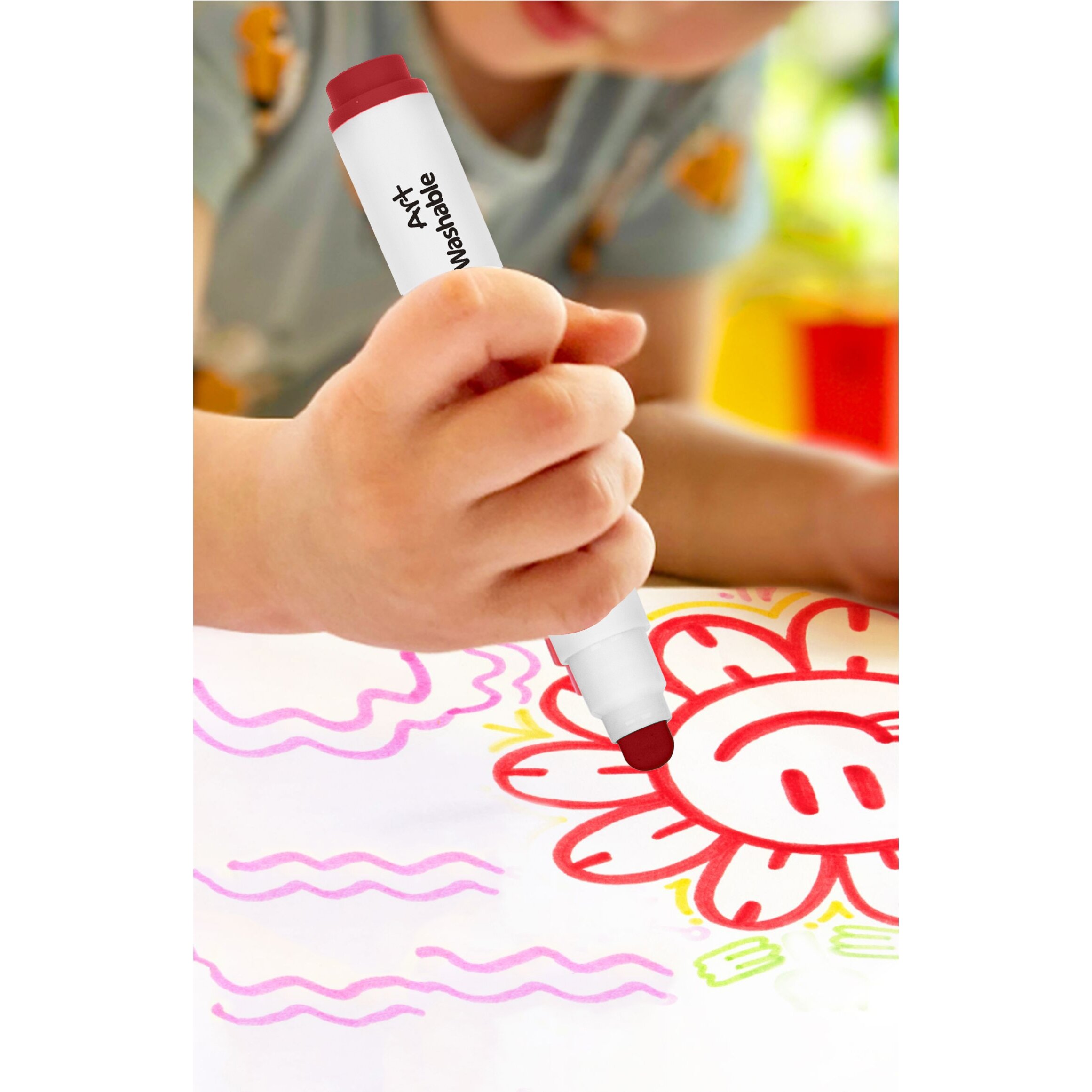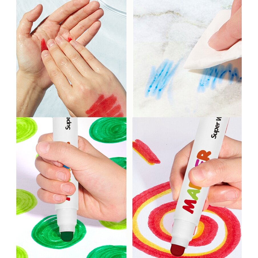Markeriai sukurti taip, kad dažai lengvai nusiplautų nuo odos ir daugumos paviršių, todėl kūryba tampa dar smagesnė tiek vaikams, tiek tėvams. Apvalus, tvirtas galiukas leidžia brėžti ryškias linijas ir patogiai spalvinti didesnius plotus.