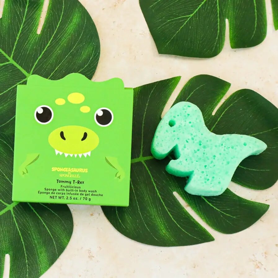 Spongellé „Dinozauras Tomis“ prausimosi kempinė su kūno prausikliu vaikams atgaivina priešistorinį pasaulį ir kviečia mažuosius leistis į smagų dinozaurų nuotykį vonioje. Spongeasaurus kolekcijos vaisiški aromatai – sultingas arbūzas, gaivus obuolys ir saldus cukrus – paverčia kasdienį prausimąsi džiugia, žaisminga ir įtraukiančia patirtimi.